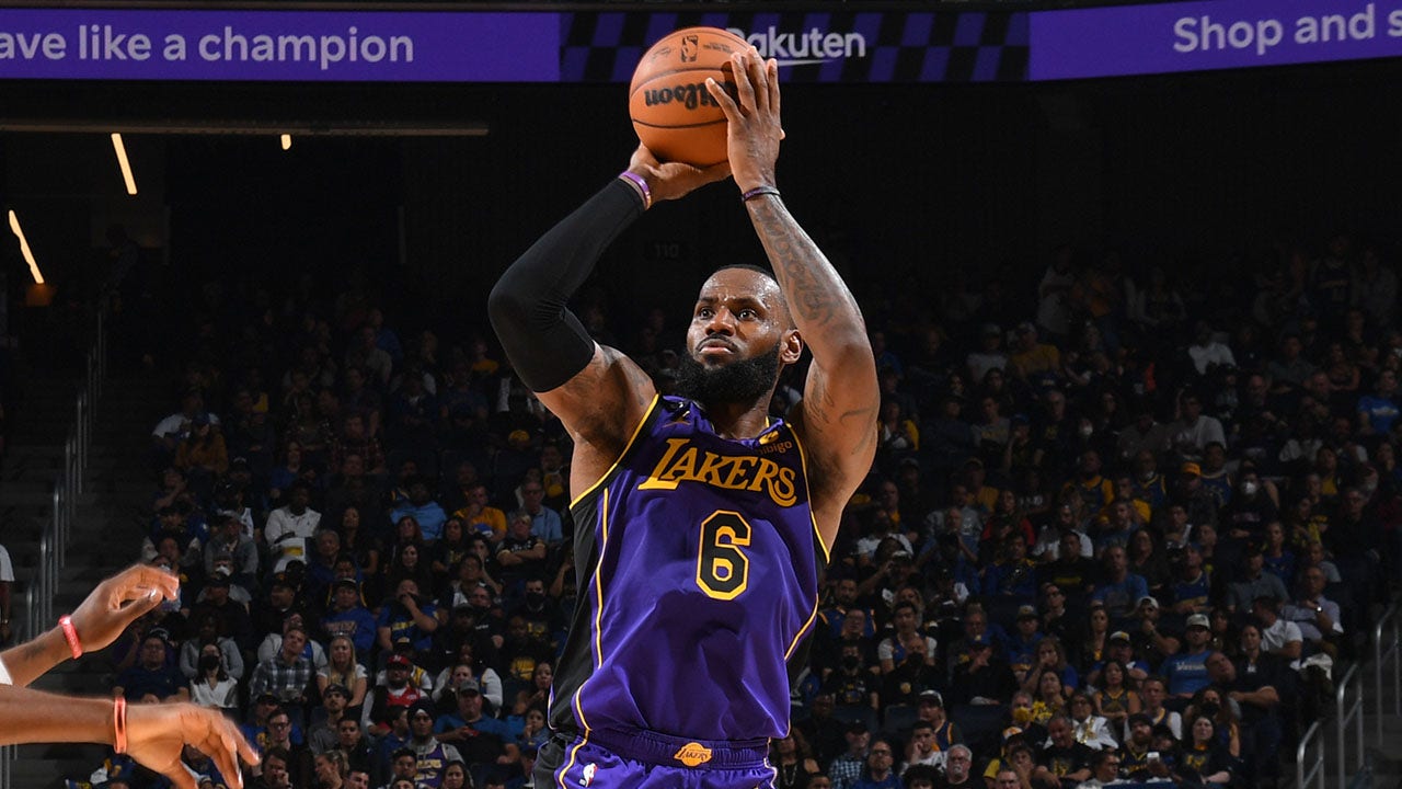LeBron James of the Los Angeles Lakers shoots the ball during the game against the Golden State Warriors at Chase Center in San Francisco, California, on Tuesday. (Noah Graham/NBAE via Getty Images)