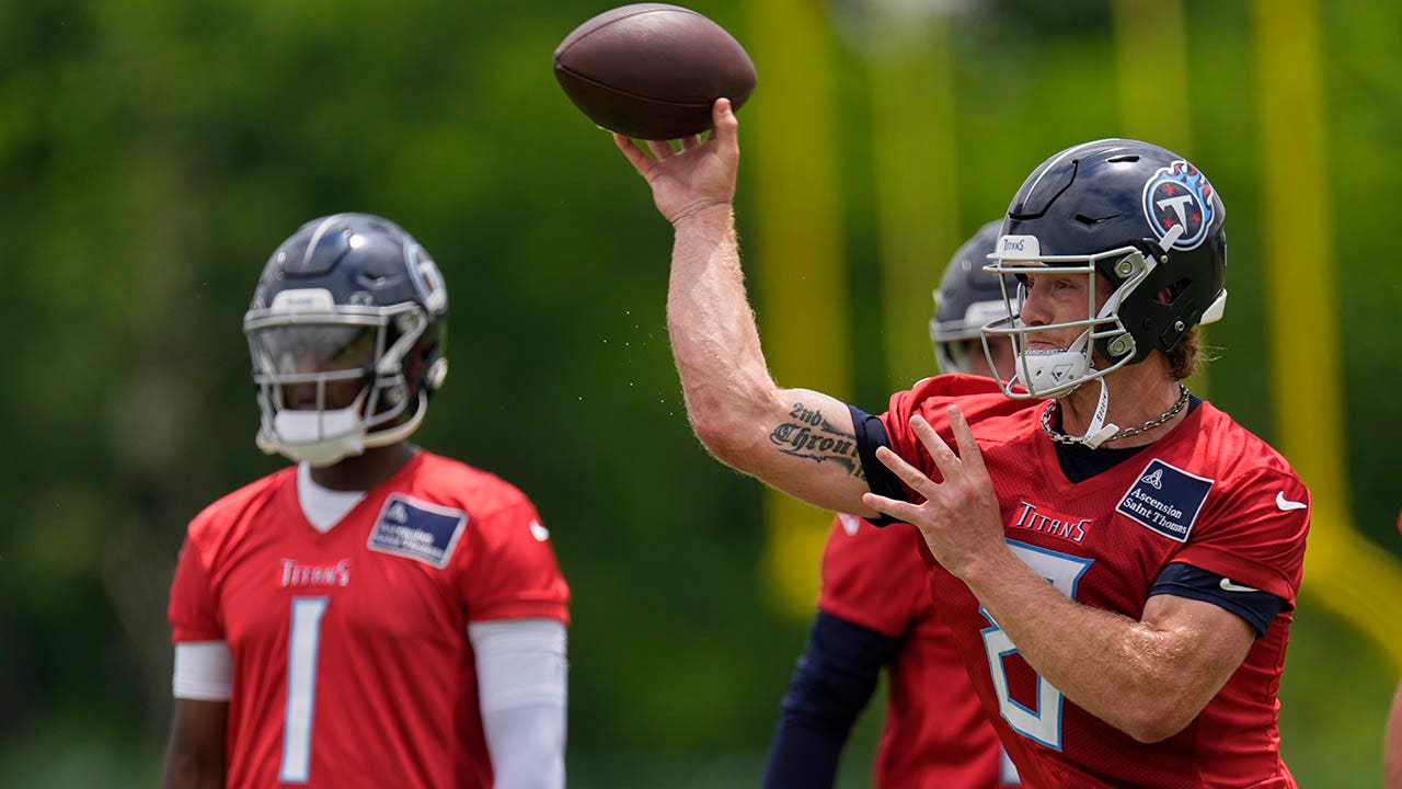 Tennessee Titans quarterback Will Levis, right, throws a pass during practice Wednesday, May 28, 2025, in Nashville. (AP Photo/George Walker IV)