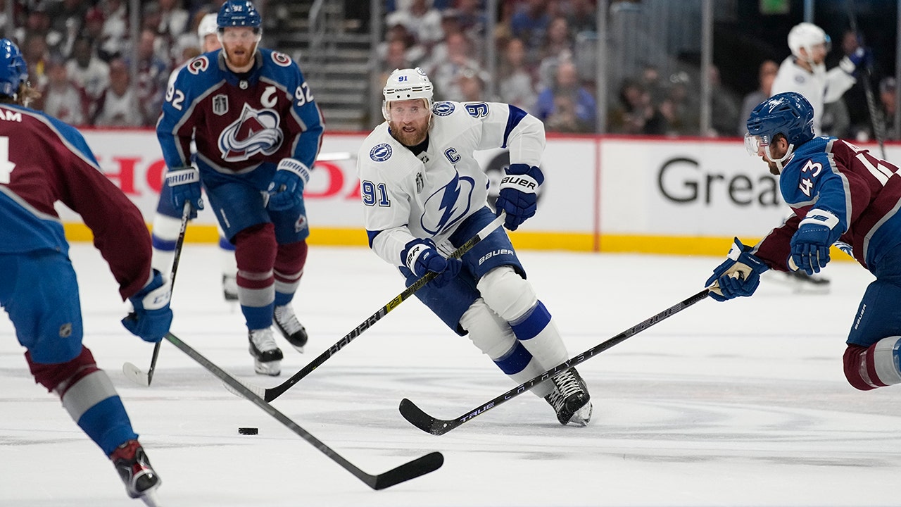 Tampa Bay Lightning center Steven Stamkos (91) controls the puck during the first period in Game 2 of the the team's NHL hockey Stanley Cup Final against the Colorado Avalanche, Saturday, June 18, 2022, in Denver. (AP Photo/John Locher)