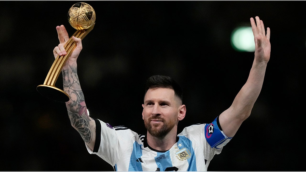 Lionel Messi waves after receiving the Golden Ball award at the end of the World Cup final match between Argentina and France at the Lusail Stadium in Lusail, Qatar, Sunday, Dec. 18, 2022. (AP Photo/Martin Meissner)