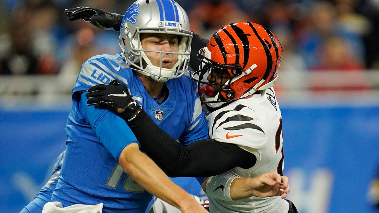 Detroit Lions quarterback Jared Goff is pressured by Cincinnati Bengals defensive end Trey Hendrickson during the first half Sunday, Oct. 17, 2021, in Detroit. (AP Photo/Paul Sancya)