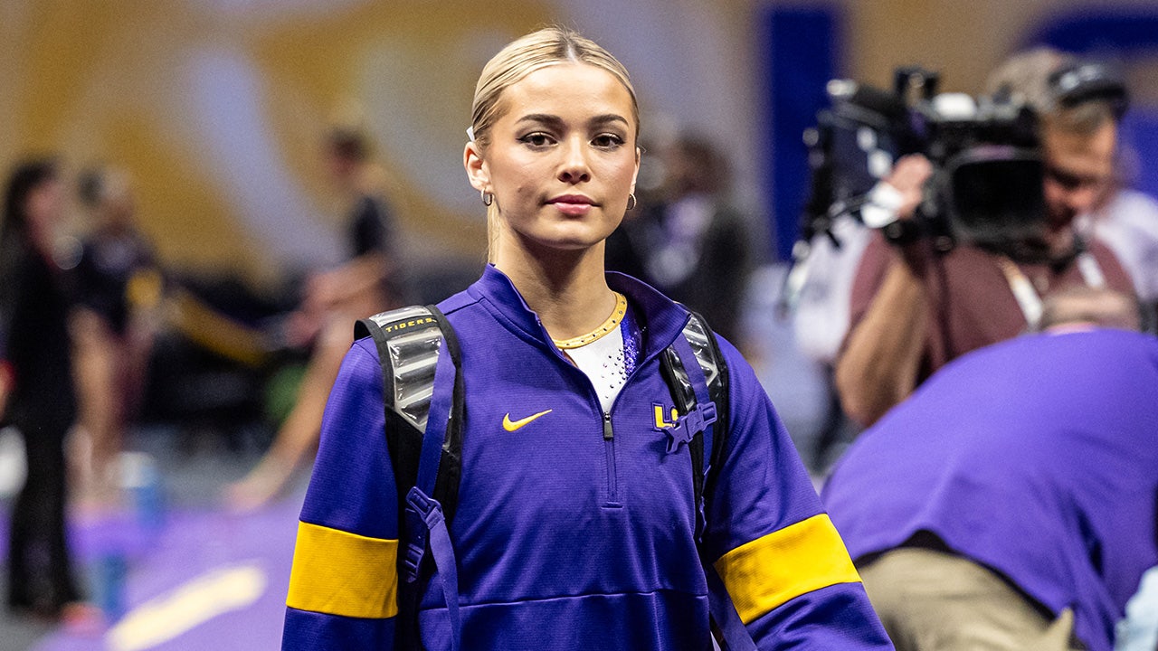 Olivia Dunne of the LSU Tigers prior to a meet against the Auburn Tigers at Neville Arena on March 14, 2025 in Auburn, Alabama. (Stew Milne/Getty Images)