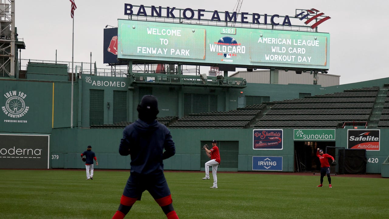 Rain fell steadily in the city, and the tarp never came off the Fenway infield for what became a workout day for the wild-card qualifiers. The Yankees made it optional, with about half the team coming to the ballpark but doing their work indoors; about a dozen Red Sox played catch in the outfield.
