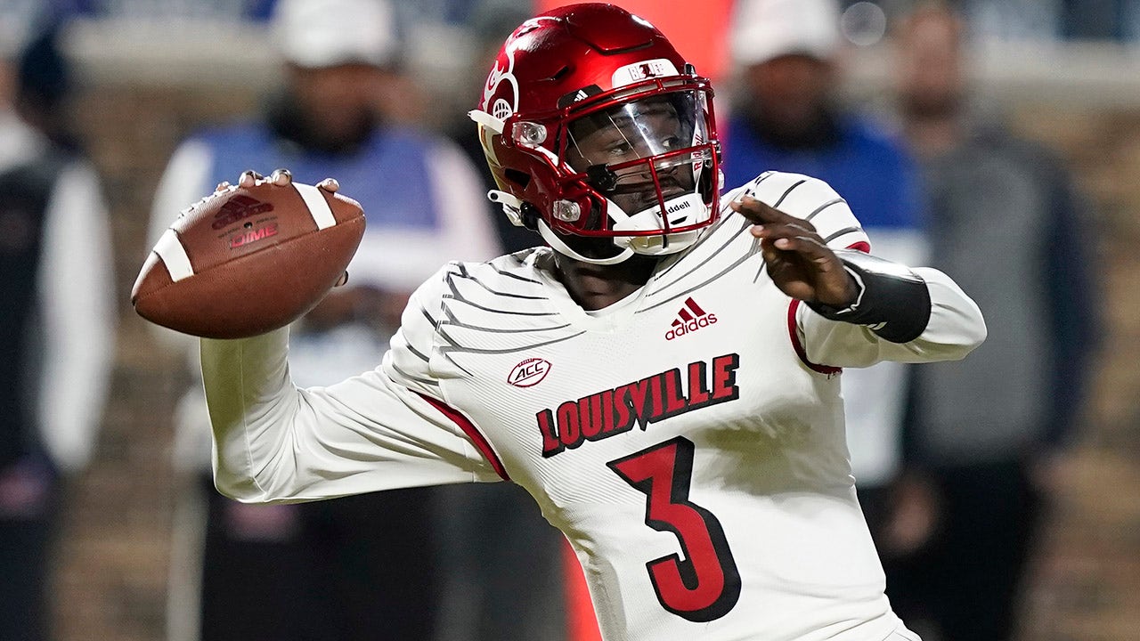 Louisville quarterback Malik Cunningham (3) looks to pass against Duke during the first half of an NCAA college football game in Durham, N.C., Thursday, Nov. 18, 2021. (AP Photo/Gerry Broome)