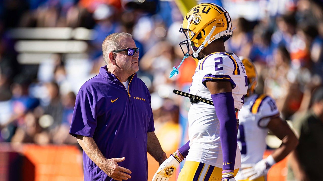 LSU Tigers head coach Brian Kelly talks with LSU Tigers wide receiver Kyren Lacy before a game against the Florida Gators at Ben Hill Griffin Stadium. (Matt Pendleton-Imagn Images)