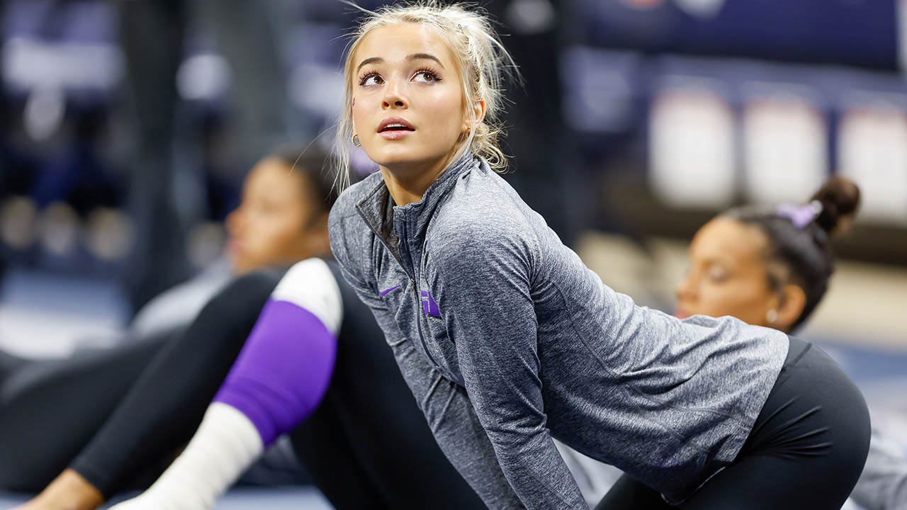 Olivia Dunne of LSU stretches before a meet at Neville Arena on Feb. 10, 2023, in Auburn, Alabama. (Stew Milne/Getty Images)