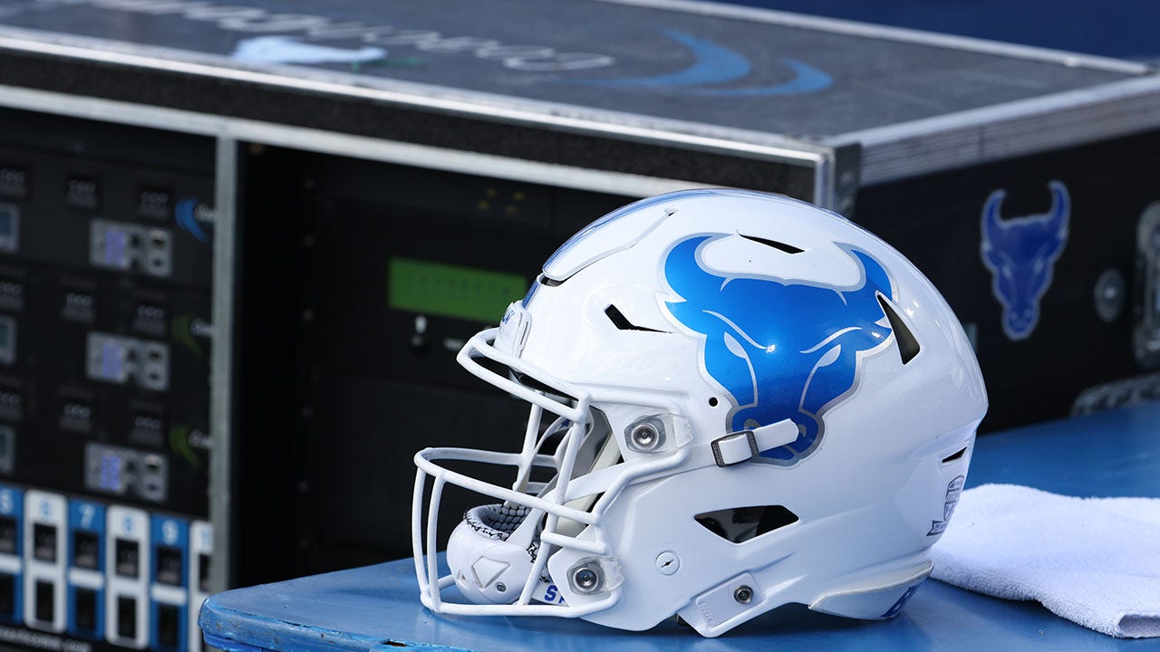 A view of a Buffalo Bulls players helmet on the bench during a game against the Coastal Carolina Chanticleers at UB Stadium on Sept. 18, 2021 in Buffalo, New York. (Timothy T Ludwig/Getty Images)