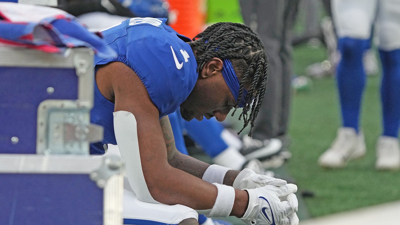 Malik Nabers of the Giants sits on the bench late in the fourth quarter on Sunday. (Chris Pedota, NorthJersey.com/USA TODAY NETWORK via Imagn Images)