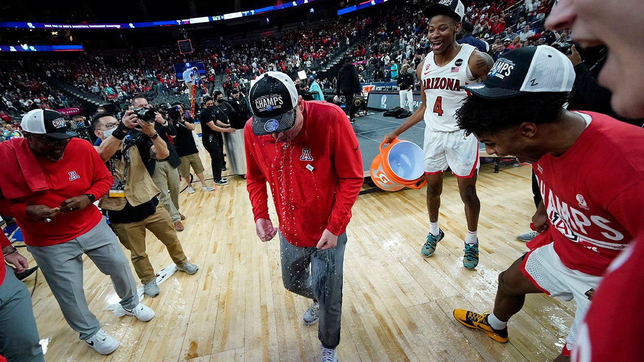 Arizona head coach Tommy Lloyd is doused with water after by Arizona's Dalen Terry (4) after defeating UCLA in an NCAA college basketball game in the championship of the Pac-12 tournament Saturday, March 12, 2022, in Las Vegas. (AP Photo/John Locher)