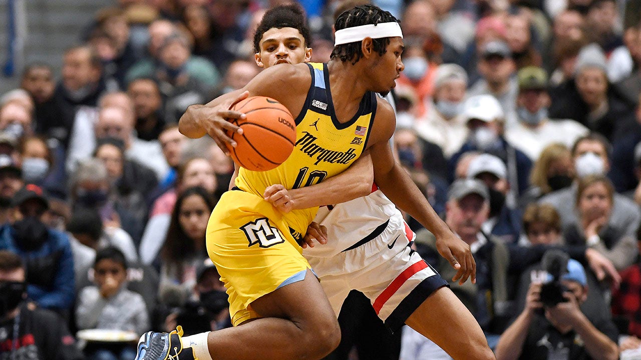Marquette's Justin Lewis (10) is guarded by Connecticut's Andre Jackson in the first half of an NCAA college basketball game, Tuesday, Feb. 8, 2022, in Hartford, Conn. (AP Photo/Jessica Hill)