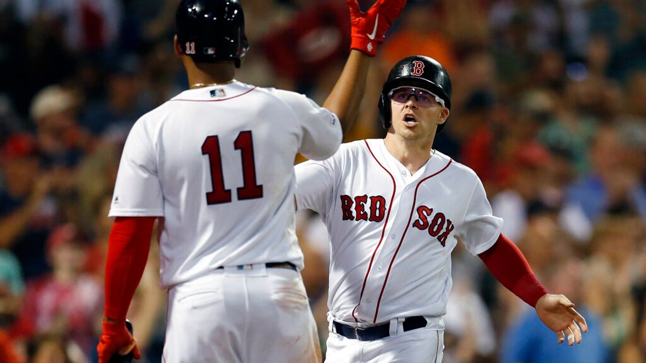 Boston Red Sox's Brock Holt celebrates with Rafael Devers (11) after scoring on a two-run single by Mookie Betts during the fifth inning of a baseball game against the Toronto Blue Jays in Boston, Tuesday, July 16, 2019. (AP)