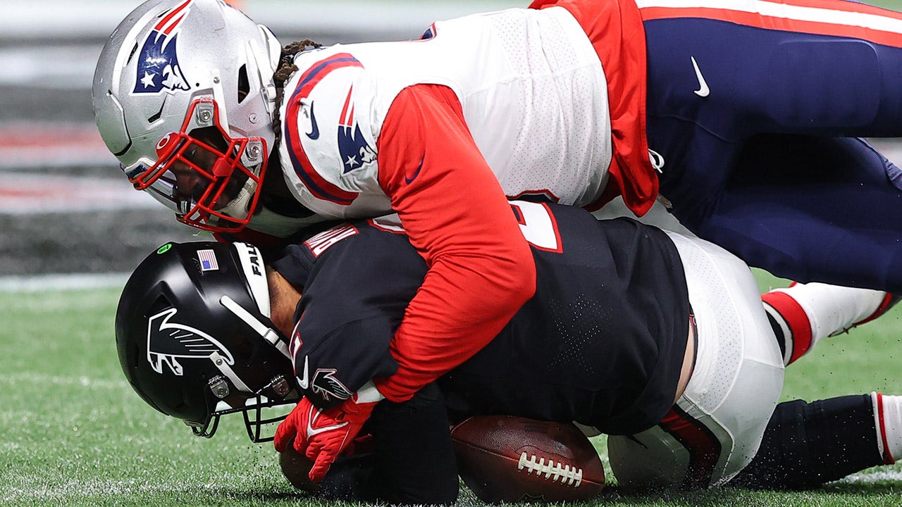 New England Patriots outside linebacker Matt Judon (9) sacks Atlanta Falcons quarterback Matt Ryan (2) during the first half of an NFL football game, Thursday, Nov. 18, 2021, in Atlanta. (AP Photo/Brynn Anderson)