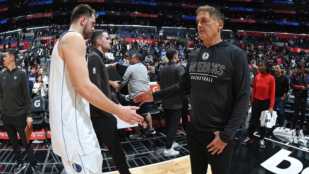 Luka Doncic of the Dallas Mavericks and team owner Mark Cuban shake hands during the game against the Los Angeles Clippers at Crypto.Com Arena in Los Angeles on Jan. 10, 2023. (Andrew D. Bernstein/NBAE via Getty Images)