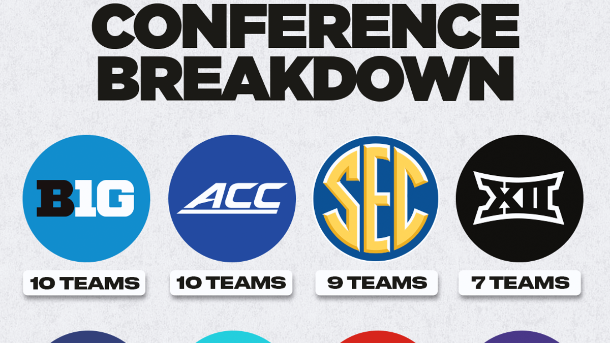 As for conference representation, the Big Ten and the ACC lead the way with 10 teams each in DeCourcy's latest tournament projections, followed by the SEC with nine teams, the Big 12 with seven teams and the Big East with three. The West Coast, Atlantic 10 and Mountain West conferences have two teams each.