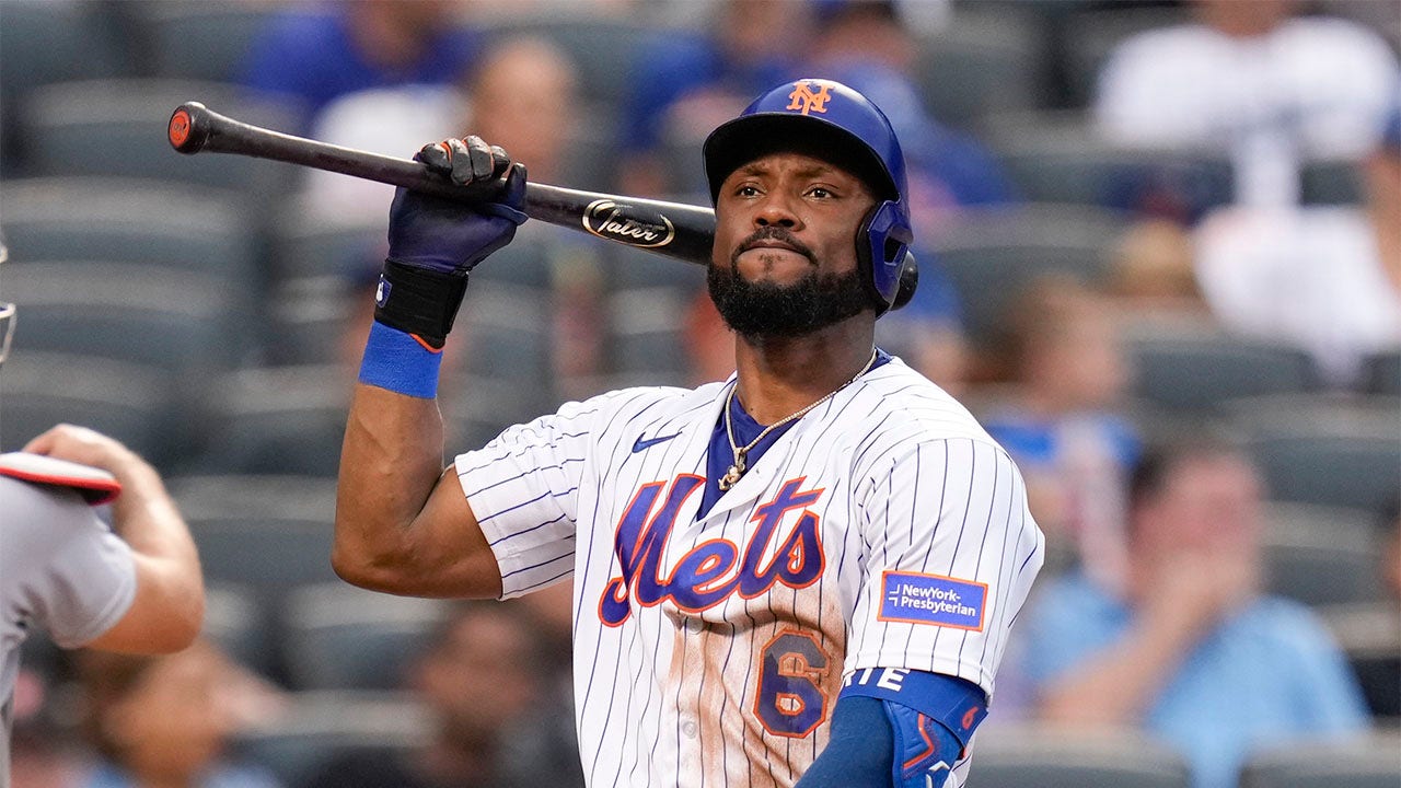 New York Mets Starling Marte reacts after striking out during the seventh inning of a baseball game against the Los Angeles Dodgers at Citi Field, Sunday, July 16, 2023, in New York. (AP Photo/Seth Wenig)