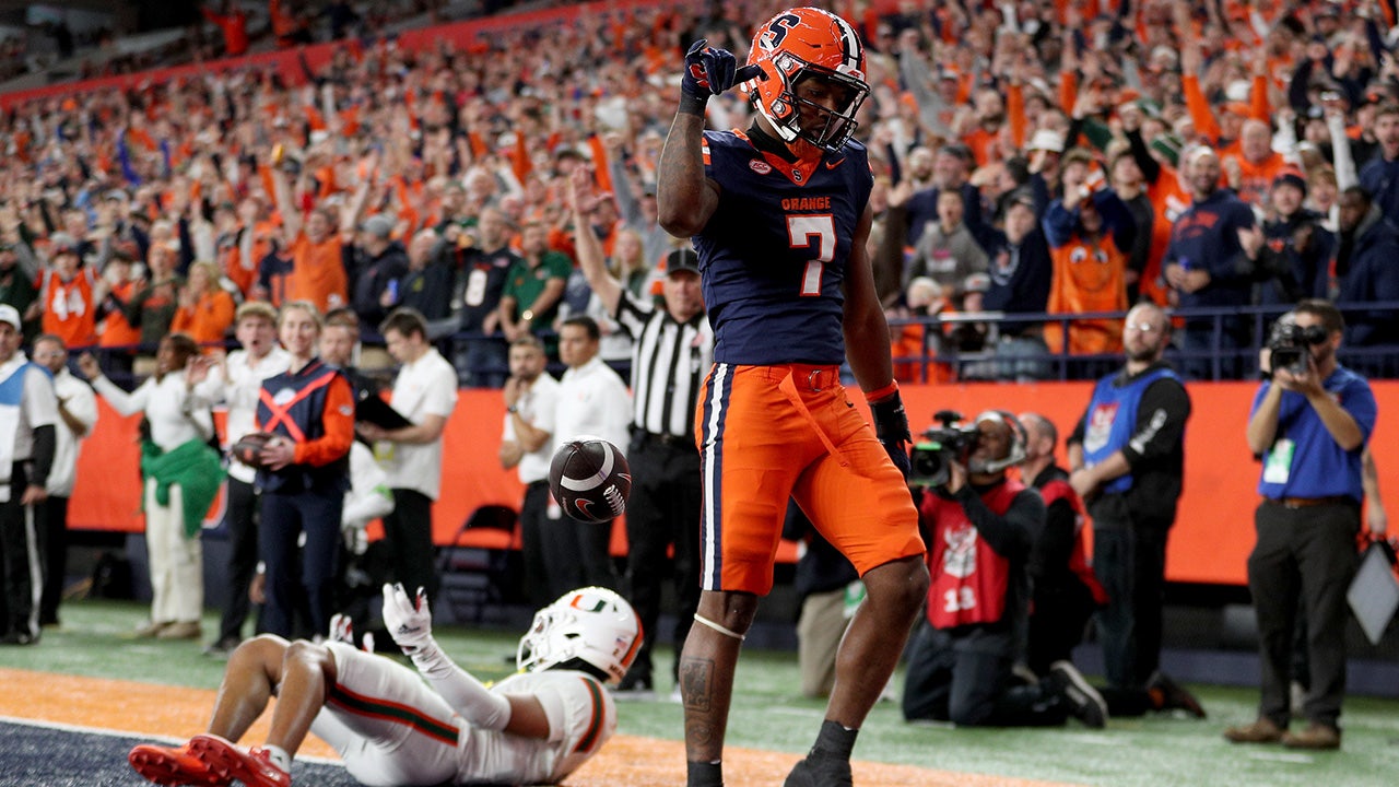 Jackson Meeks (7) of the Syracuse Orange reacts after scoring a touchdown during the second quarter against the Miami Hurricanes at JMA Wireless Dome Nov. 30, 2024, in Syracuse, N.Y. (Bryan M. Bennett/Getty Images)