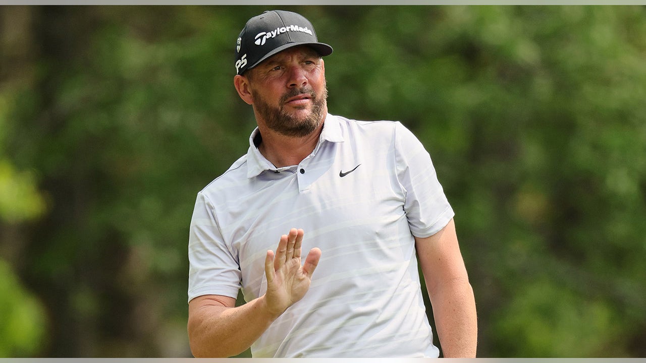 Michael Block of the United States, PGA of America Club Professional, reacts on the third tee during the final round of the 2023 PGA Championship at Oak Hill Country Club on May 21, 2023, in Rochester, New York. (Andy Lyons/Getty Images)
