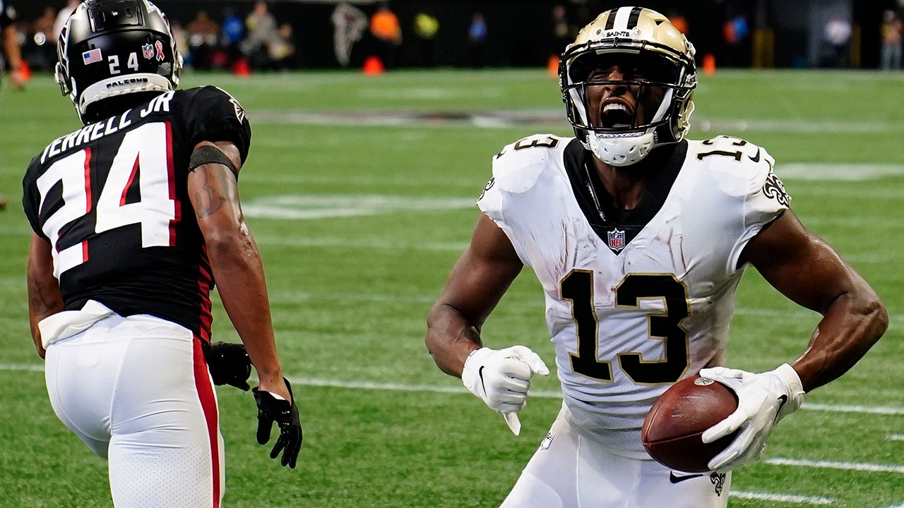 New Orleans Saints wide receiver Michael Thomas (13) celebrates his touchdown catch against Atlanta Falcons cornerback A.J. Terrell (24) during the second half of an NFL football game, Sunday, Sept. 11, 2022, in Atlanta. (AP Photo/Brynn Anderson)