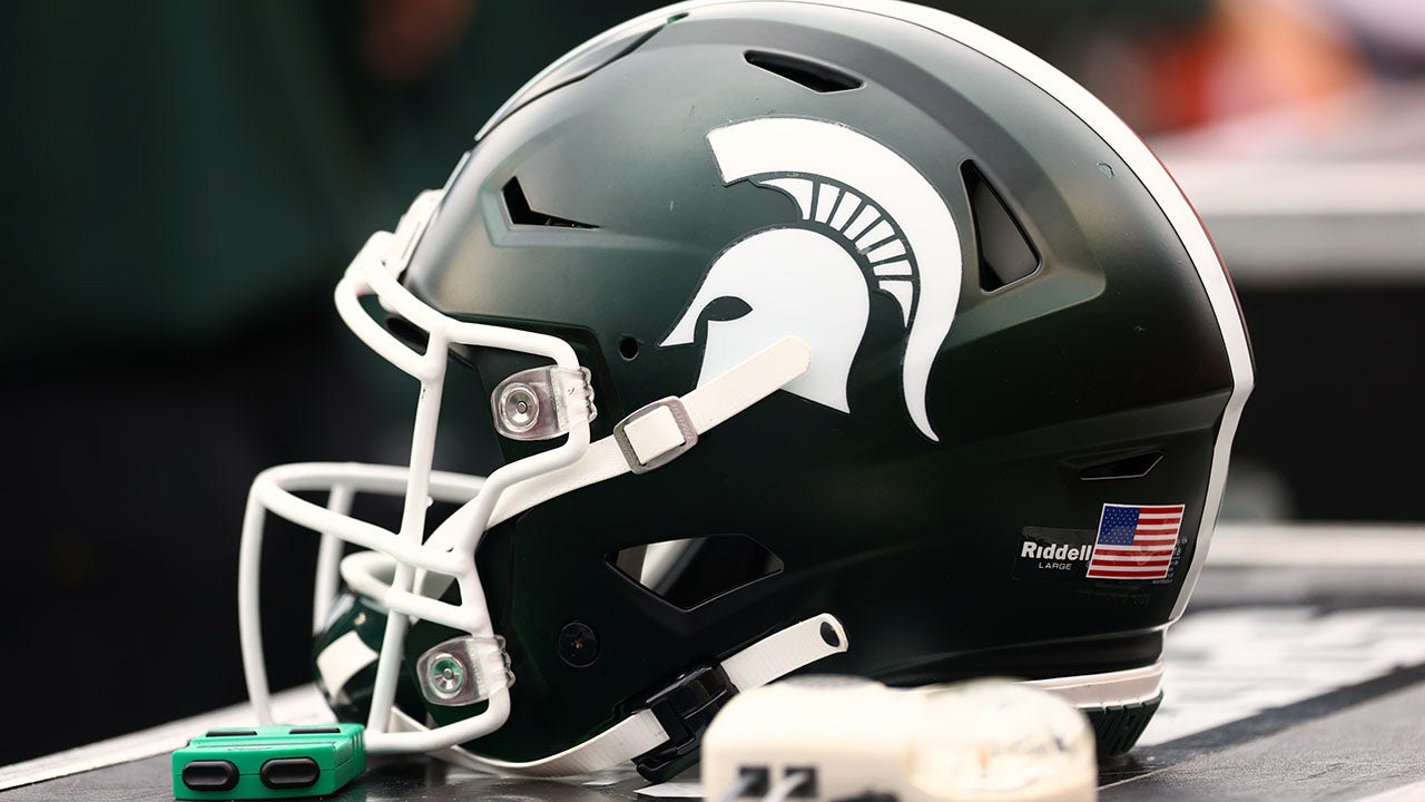 A Michigan State Spartans helmet sits on the sidelines during a game against the Rutgers Scarlet Knights at SHI Stadium on October 9, 2021 in Piscataway, New Jersey. (Rich Schultz/Getty Images)
