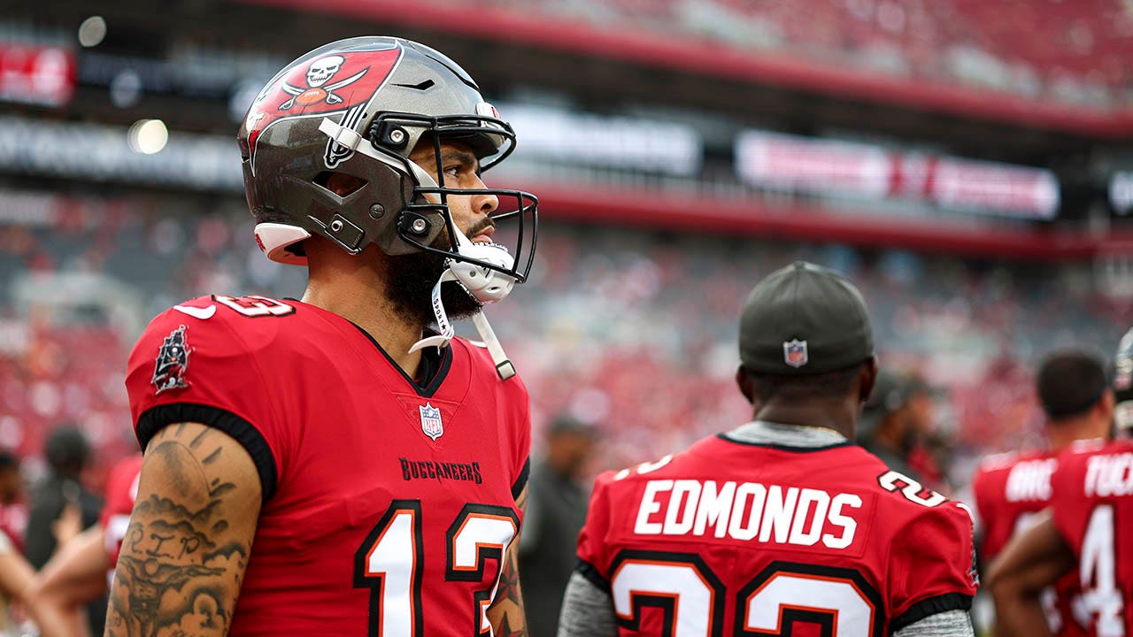 Mike Evans, #13 of the Tampa Bay Buccaneers, stands on the field prior to an NFL preseason football game against the Baltimore Ravens at Raymond James Stadium on August 26, 2023, in Tampa, Florida. (Kevin Sabitus/Getty Images)