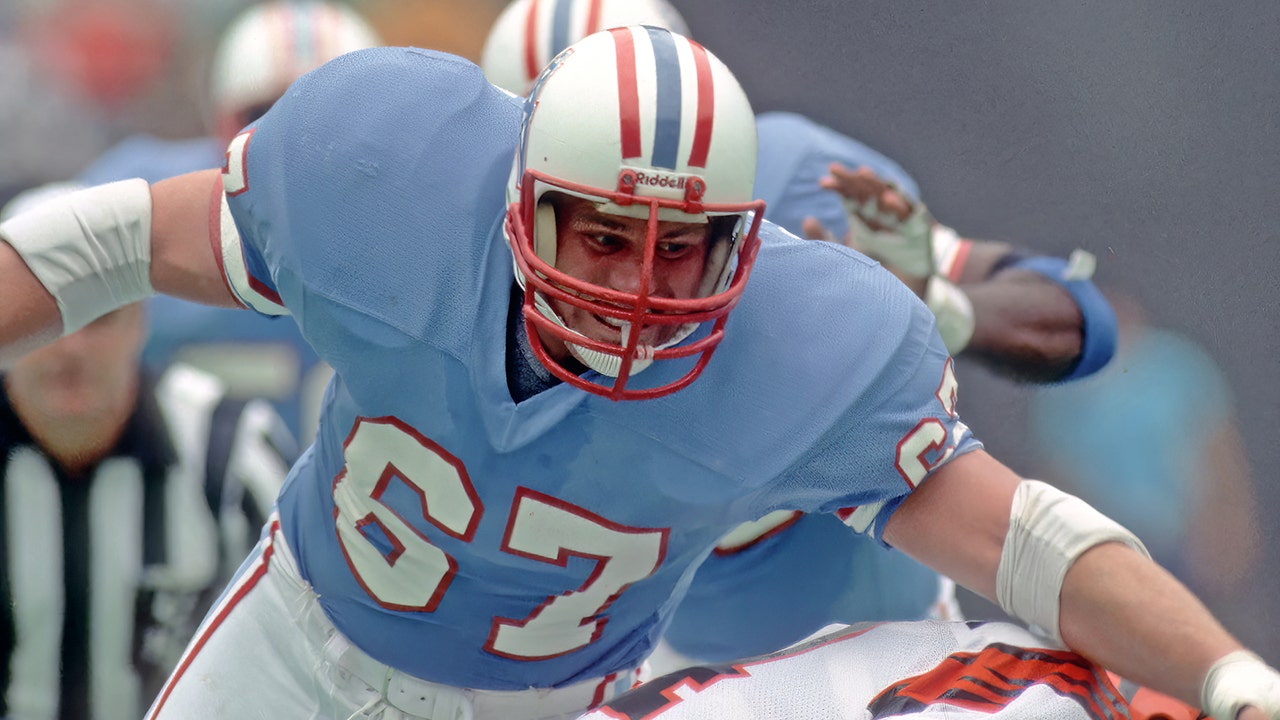 Defensive lineman Mike Stensrud of the Houston Oilers on the sideline during a game at RFK Stadium on Sept. 15, 1985, in Washington, D.C. (George Gojkovich/Getty Images)