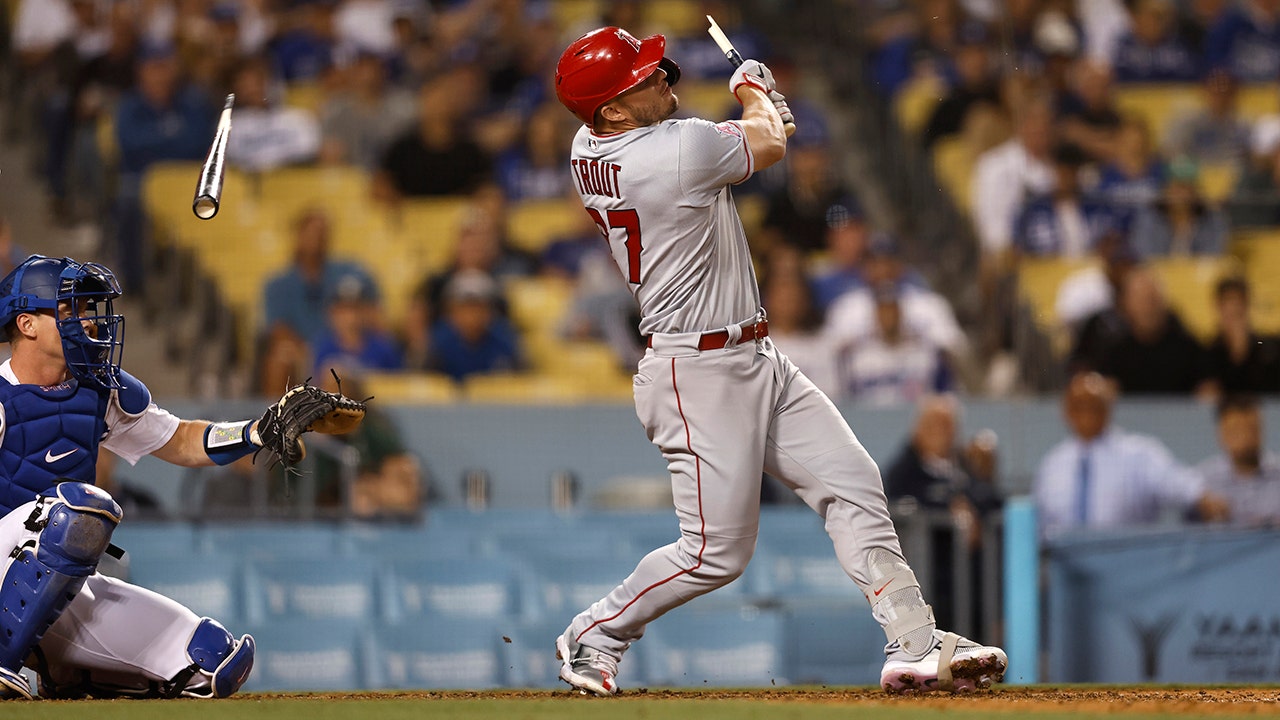 Mike Trout #27 of the Los Angeles Angels breaks his bat as he hits a single against the Los Angeles Dodgers during the ninth inning at Dodger Stadium. (Michael Owens/Getty Images)