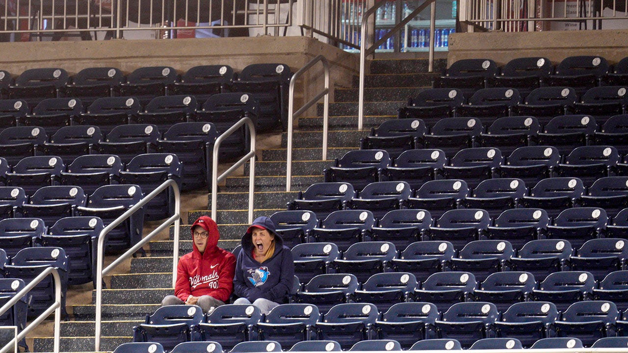 Two Washington Nationals fans watch a game against the Atlanta Braves surrounded by empty seats during the ninth inning at Nationals Park Sept. 27, 2022, in Washington, D.C. (AP Photo/Jess Rapfogel)