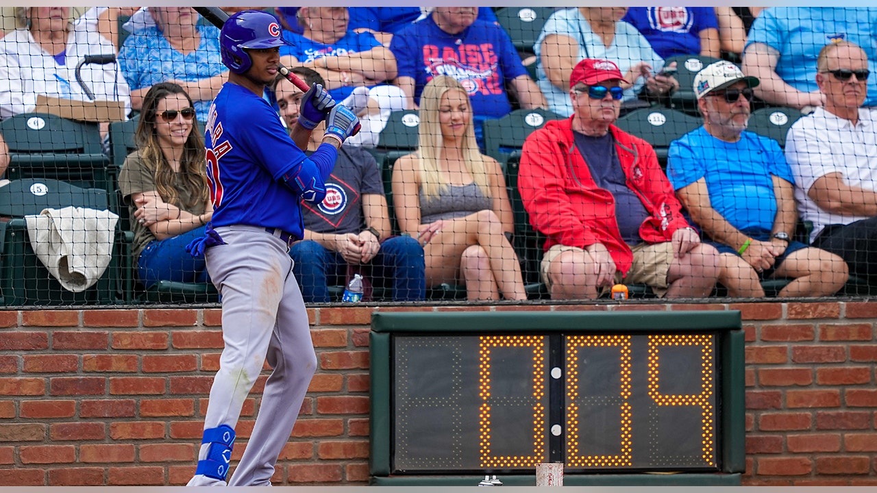 Sergio Alcantara #60 of the Chicago Cubs waits in the on deck circle next to the pitch clock in the fourth inning against the Texas Rangers during a Spring Training game at Surprise Stadium on March 07, 2023, in Surprise, Arizona. (Dylan Buell/Getty Images)