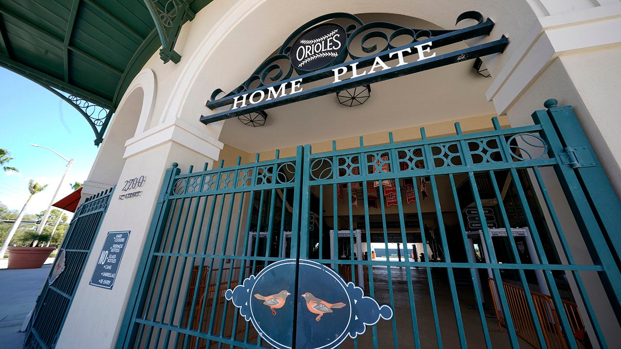 With the Major League Baseball Grapefruit League schedule on hold, Ed Smith Stadium, the Spring home of the Baltimore Orioles, is empty on Sunday, Feb. 27, 2022 in Sarasota, Fla. (AP Photo/Gene J. Puskar)