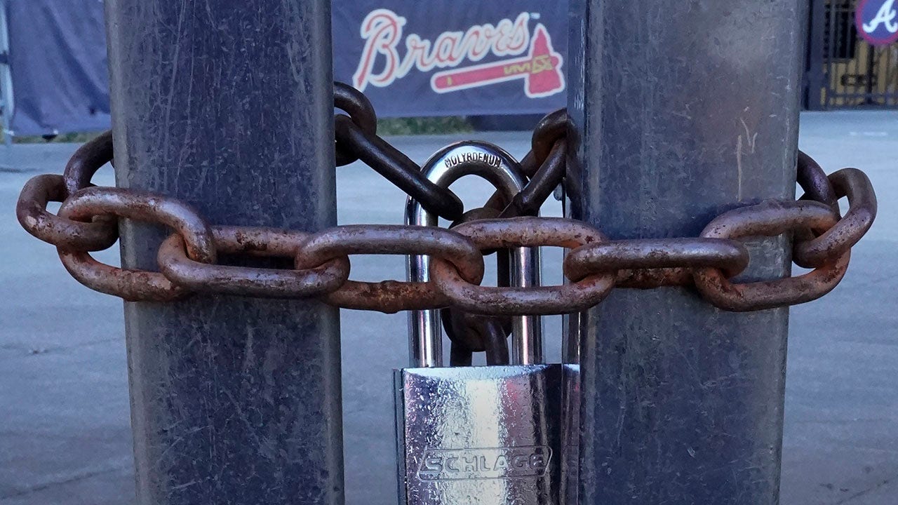 Locked gates are shown at Truist Park, home of the Atlanta Braves baseball team, Wednesday, March 2, 2022, in Atlanta. With owners and players unable to agree on a labor contract to replace the collective bargaining agreement that expired Dec. 1, baseball commissioner Rob Manfred followed through with his threat on Tuesday and canceled the first two series for each of the 30 major league teams. (AP Photo/John Bazemore)