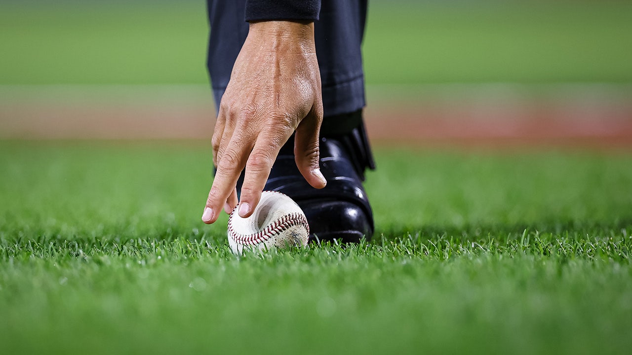 A general view of an umpires hand picking up a ball during the second inning between the Baltimore Orioles and the Detroit Tigers at Oriole Park at Camden Yards on April 22, 2023 in Baltimore, Maryland. (Scott Taetsch/Getty Images)