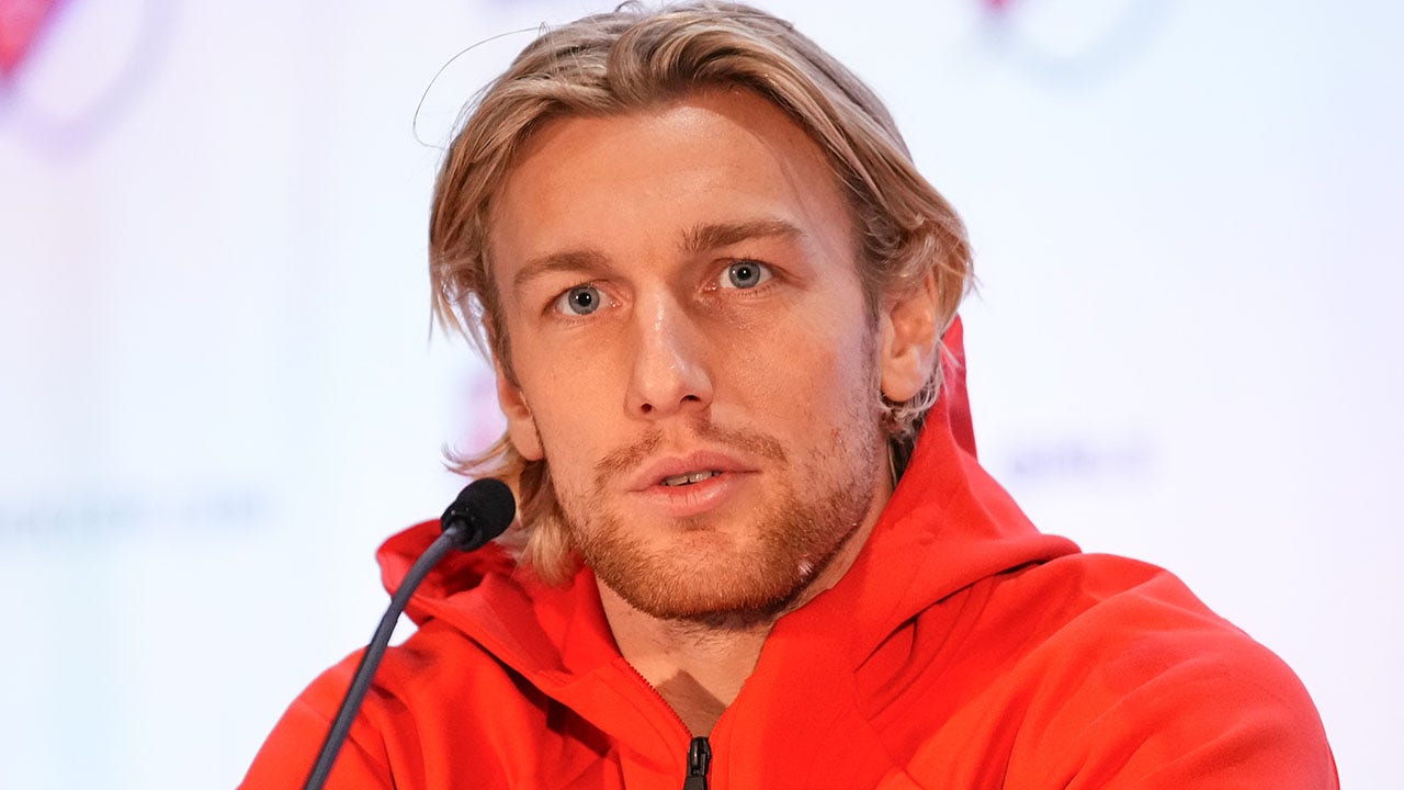 Emil Forsberg of the New York Red Bulls speaks at a press conference during a MLS media day event at the Miami Convention Center on Jan. 11, 2024 in Miami. (Rich Storry/Getty Images)