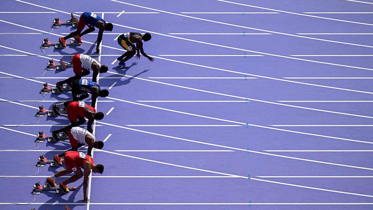 Mozambique's Steven Sabino walks off the track after disqualification as other athletes prepare to take the start in the men's 100m heat of the athletics event on August 3, 2024. (Martin Bernetti/AFP via Getty Images)
