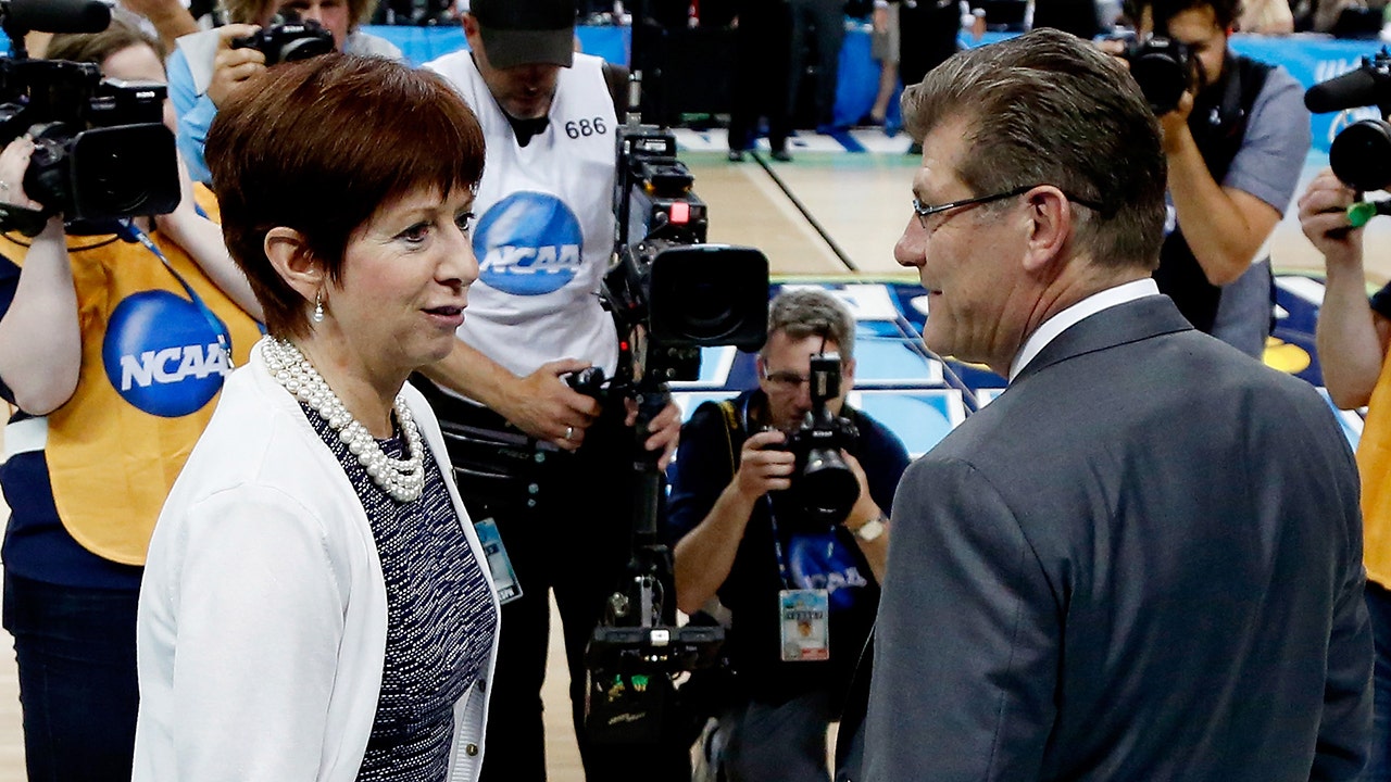 TAMPA, FL - APRIL 07: Head coach Muffet McGraw of the Notre Dame Fighting Irish (L) and head coach Geno Auriemma of the Connecticut Huskies meet prior to the start of the NCAA Women's Final Four National Championship at Amalie Arena on April 7, 2015 in Tampa, Florida. (Mike Carlson/Getty Images)