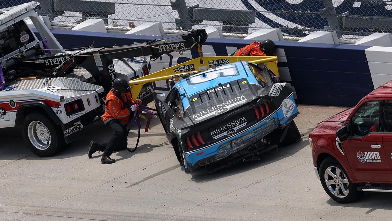 The #15 Millennium Jet Card Ford, driven by Brennan Poole, is towed after an on-track incident during the NASCAR Cup Series Würth 400 at Dover International Speedway on May 1, 2023 in Dover, Delaware. (Tim Nwachukwu/Getty Images)