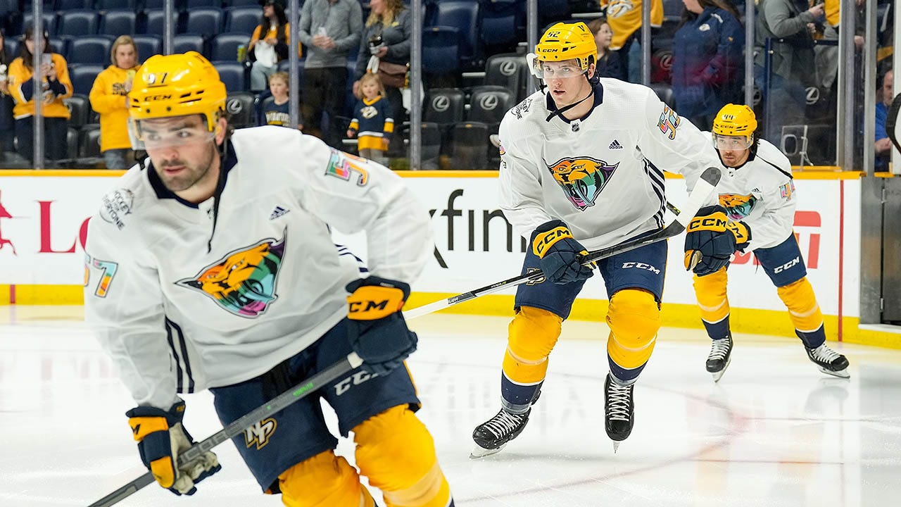 Cal Foote #52 and Kiefer Sherwood #44 of the Nashville Predators take the ice for warmups on Hockey Is For Everyone night prior to an NHL game against the Vegas Golden Knights at Bridgestone Arena on April 4, 2023 in Nashville, Tennessee. (John Russell/NHLI via Getty Images)