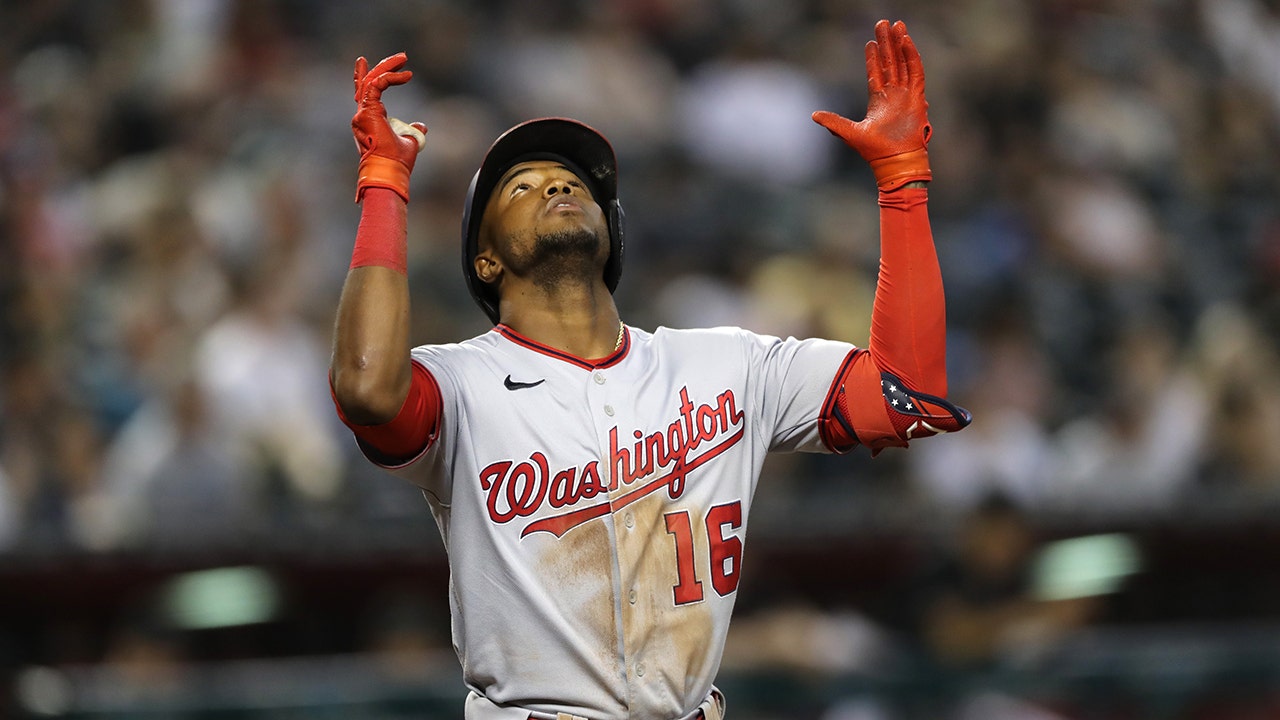 Victor Robles (16) of the Washington Nationals celebrates his home run during the game between the Washington Nationals and the Arizona Diamondbacks at Chase Field on July 23, 2022, in Phoenix, Arizona. (Rebecca Noble/Getty Images)