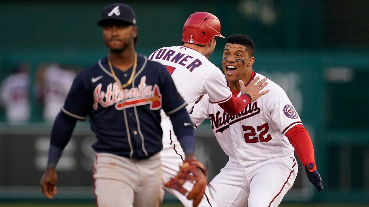 But Washington loaded the bases in the eighth against A.J. Minter, and Andrew Stevenson — starting in left field for Kyle Schwarber, part of the IL contingent — made it 5-all with an RBI infield single that went off third baseman Austin Riley's glove.