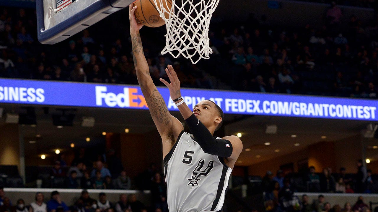 San Antonio Spurs guard Dejounte Murray shoots a layup during the first half of the team's NBA basketball game against the Memphis Grizzlies on Monday, Feb. 28, 2022, in Memphis, Tenn. (AP Photo/Brandon Dill)
