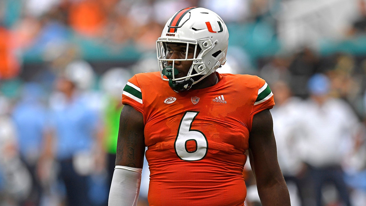 Miami defensive lineman Darrell Jackson, Jr., #6, looks to the bench in between plays in the first quarter as the University of Miami Hurricanes faced the University of North Carolina at Chapel Hill Tar Heels on Oct. 8, 2022, at Hard Rock Stadium in Miami Gardens, Florida. (Samuel Lewis/Icon Sportswire via Getty Images)