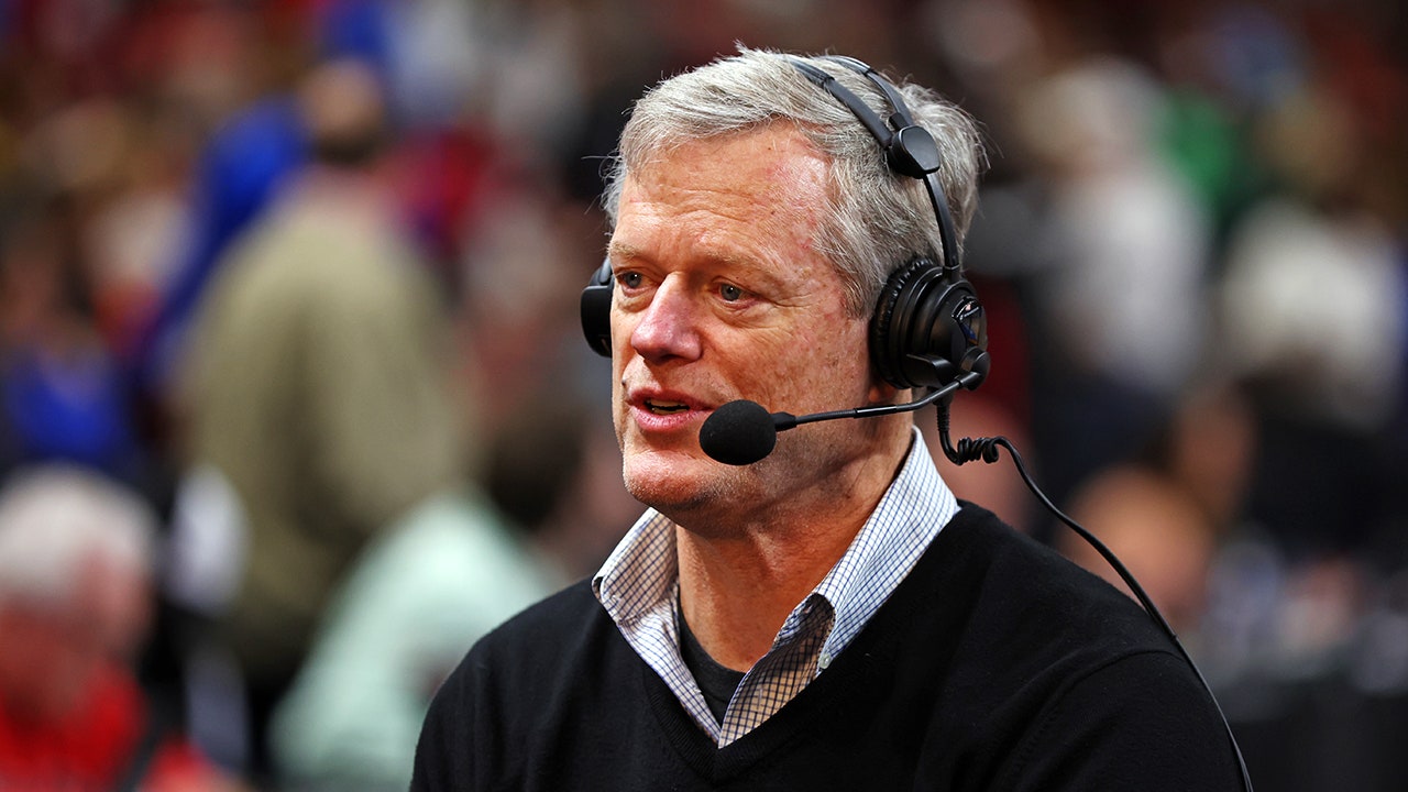NCAA President Charlie Baker gives a television interview during a game between the UCLA Bruins and the South Carolina Gamecocks in the Sweet 16 round of the NCAA Women's Tournament at Bon Secours Wellness Arena March 25, 2023, in Greenville, S.C. (Maddie Meyer/Getty Images)