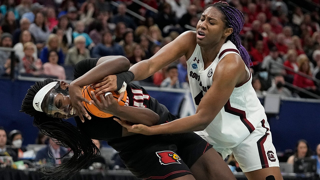 South Carolina's Aliyah Boston fouls Louisville's Olivia Cochran during the second half of a college basketball game in the semifinal round of the Women's Final Four NCAA tournament Friday, April 1, 2022, in Minneapolis. (AP Photo/Eric Gay)