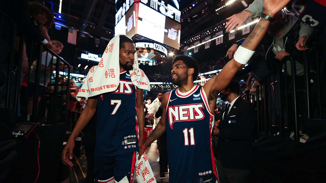Kevin Durant and Kyrie Irving during the Brooklyn Nets-Cleveland Cavaliers game on April 12, 2022, at the Barclays Center. (Nathaniel S. Butler/NBAE via Getty Images)