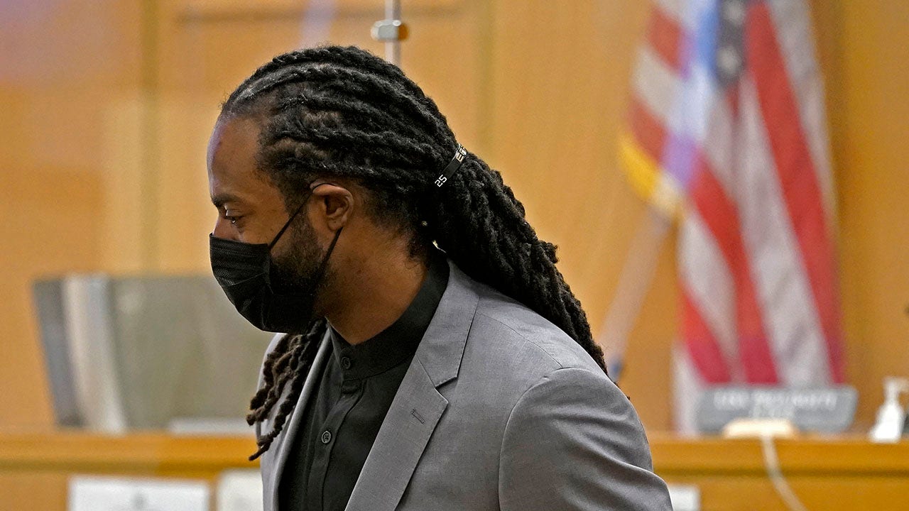 FILE - Richard Sherman stands up to leave a King County District Court hearing, Friday, July 16, 2021, in Seattle. Sherman, now with the Tampa Bay buccaneers, pleaded guilty Monday to two misdemeanor charges stemming from a drunken driving and domestic disturbance last summer as part of an agreement that spares him further jail time. (AP Photo/Ted S. Warren, File)