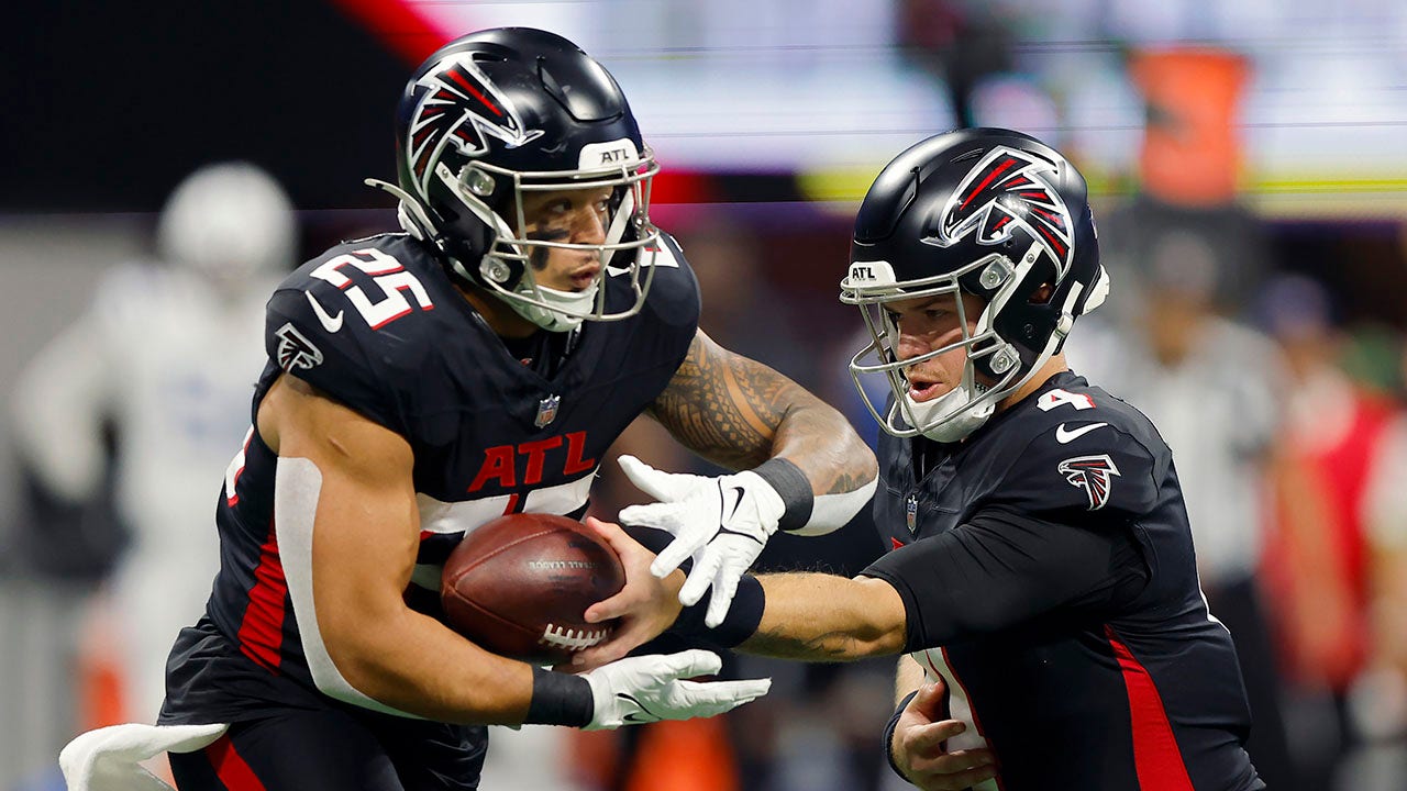 Taylor Heinicke of the Falcons hands the ball off to Tyler Allgeier during the Indianapolis Colts game at Mercedes-Benz Stadium on Dec. 24, 2023, in Atlanta. (Todd Kirkland/Getty Images)