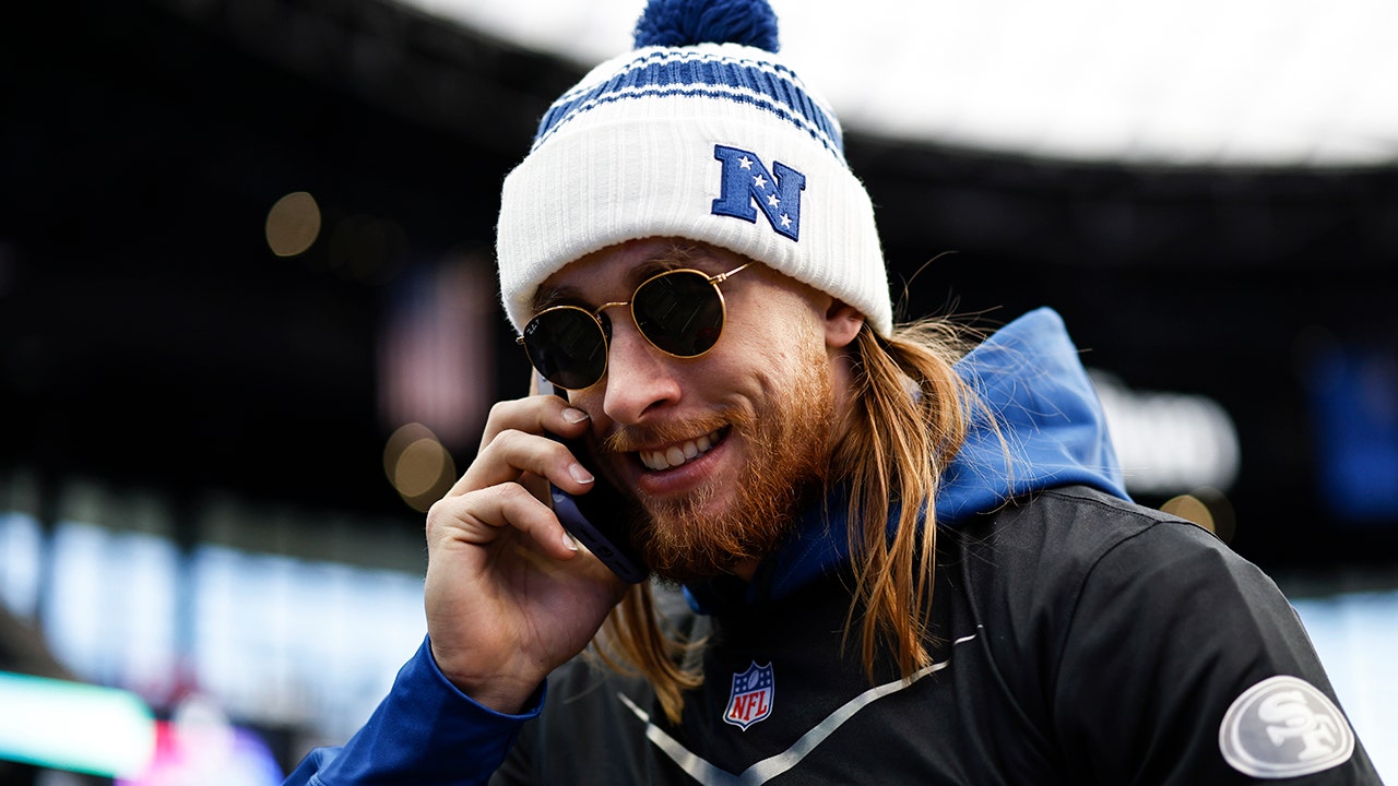 NFC tight end George Kittle, #85 of the San Francisco 49ers, reacts as he walks to his spot during a group portrait prior to an NFL Pro Bowl football game at Allegiant Stadium on Feb. 4, 2023 in Las Vegas. (Michael Owens/Getty Images)