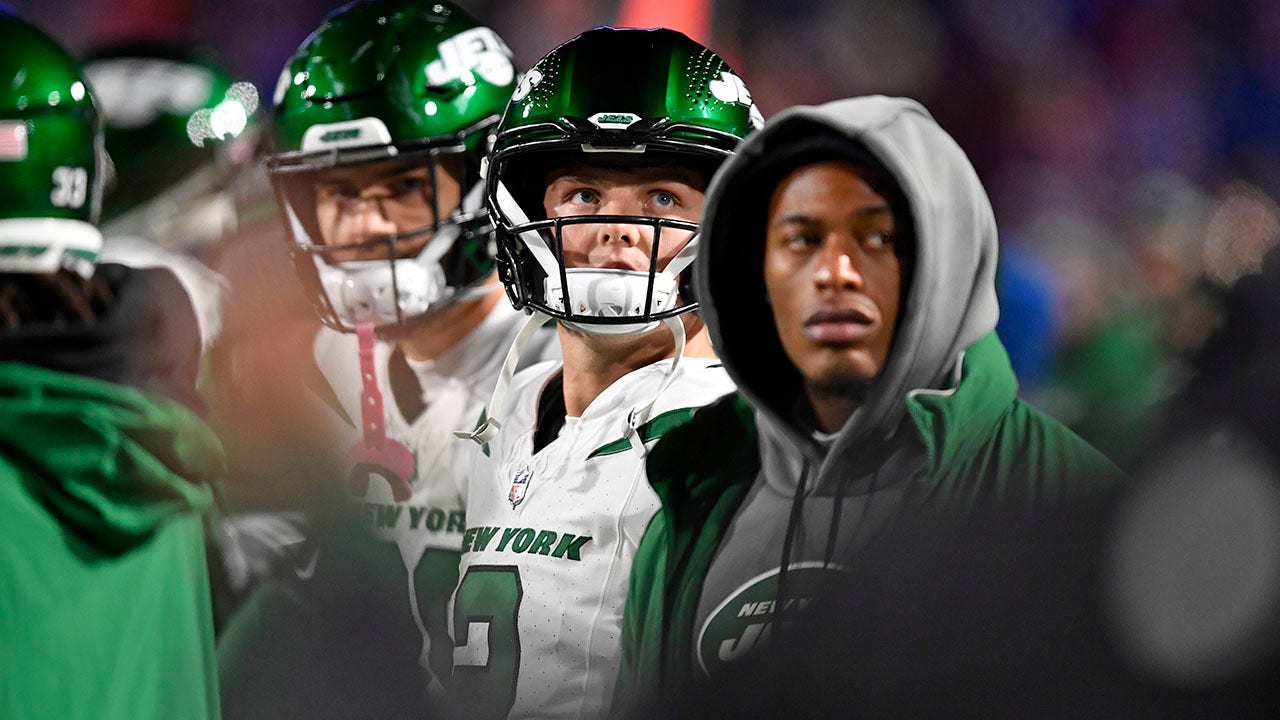 New York Jets quarterback Zach Wilson, center, stands on the sidelines after being pulled from the game against the Buffalo Bills during the second half in Orchard Park, N.Y., Sunday, Nov. 19, 2023. (AP Photo/Adrian Kraus)