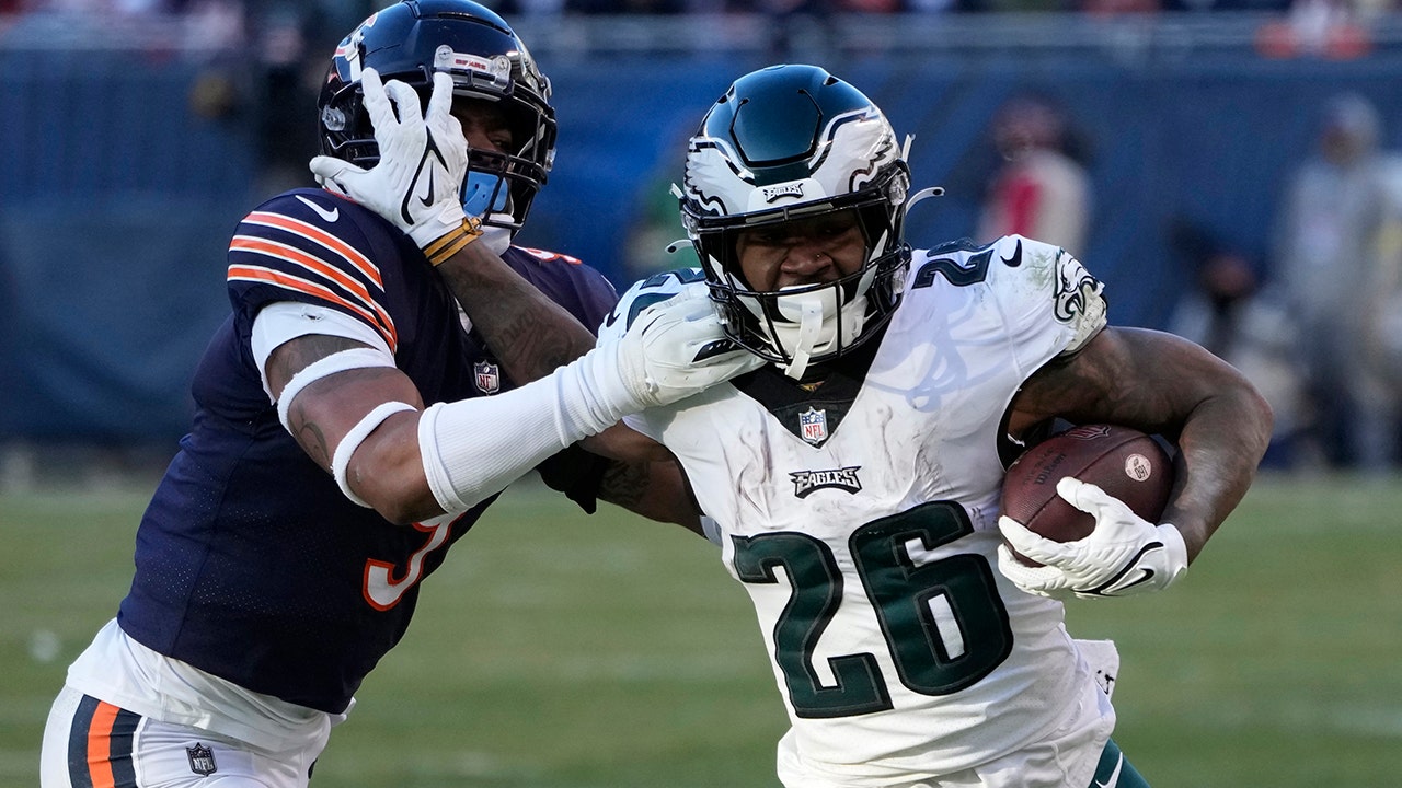 Philadelphia Eagles' Miles Sanders, right, tries to get past of Chicago Bears' Jaquan Brisker during the second half of an NFL football game, Sunday, Dec. 18, 2022, in Chicago. (AP Photo/Charles Rex Arbogast)