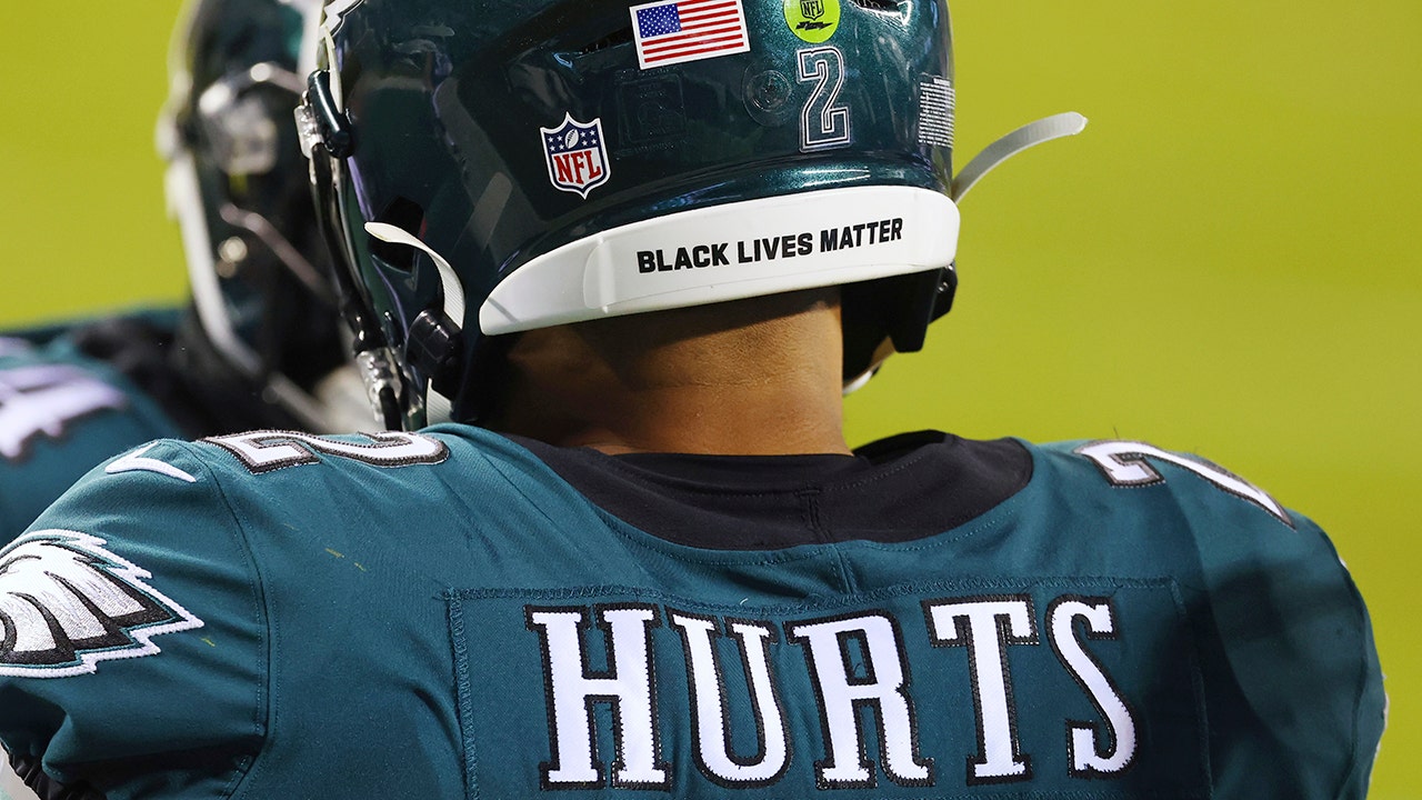 In this Jan. 3, 2021 photo, Philadelphia Eagles Jalen Hurts wears a Black Lives Matter decal on the back of his helmet during the team's NFL football game against the Washington Football Team in Philadelphia. (AP Photo/Rich Schultz, File) (AP Photo/Rich Schultz, File)