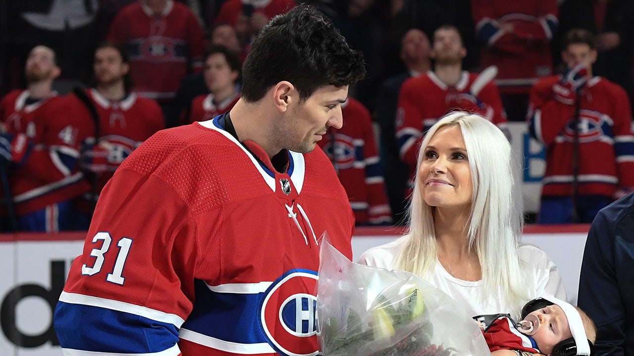 Carey Price, #31 of the Montreal Canadiens, skates with his wife and child during the NHL 100 Classic family skate following practice at Lansdowne Park on December 15, 2017, in Ottawa, Ontario, Canada. (Dave Sandford/NHLI via Getty Images)